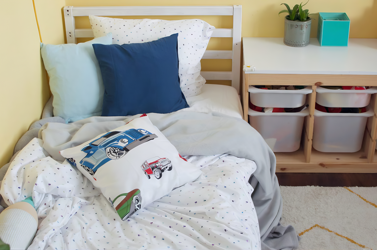 Zoberme si napríklad posteľné obliečky, tie tvoria veľkú plochu izby nielen v spálni, ale aj v detskej izbe, keďže posteľ predstavuje jeden z hlavných elementov daných miestností. Preto by okrem praktického využitia mali korešpondovať aj s celkovým dizajnom izby. Všeobecné preferencie dieťaťa sú vždy dôležité, ale aktuálne záľuby či momentálne obľúbené motívy sa dajú doplniť aj na menších prvkoch či doplnkoch. Vankúš s motívom alebo deka potlačená obľúbenou postavičkou vedia vyčarovať spokojný úsmev na tvári, ako aj príjemné prostredie na pohľad.