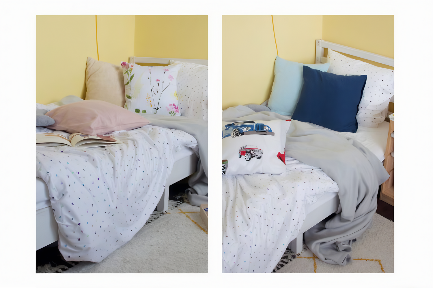 Neutrálnym riešením je použitie rovnakých obliečok s nenápadným motívom a dodatočné dekorovanie ponechať na menšie prvky – okrasná prikrývka, deka či vankúše. Naopak, peknou a vizuálne ucelenou kombináciou môžu byť jednofarebné obliečky, každé vo farebnosti vybranej dieťaťom.