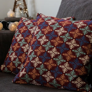 Retro návlek na dekoračný vankúšik vo vínovomodrej kombinácii s motívom snehových vločiek pripomína horskú chatu zapadnutú snehom. Pohodlne sa oprite a vychutnajte si šálku lahodného kakaa, pretože tento návlek priamo nabáda k zimnému leňošeniu. Návlekom na vankúš so zaujímavým vytkaným motívom môžete doplniť a ozvláštniť každý interiér. Vaše obývacia alebo detská izba získajú razom veselý a optimistický vzhľad :) Návlek má všívaný zips a je možné k nemu samostatne zakúpiť aj výplňový vankúšik v rovnakom rozmere.