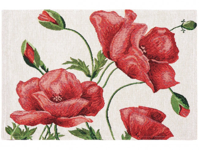 Veľké červené maky zdobia naše biele tkané prestieranie s nádychom leta. Sýto červené kvety tradičnej rastliny našich záhrad a polí Vás prenesú do pohodového vidieckeho sídla, kde čas plynie oveľa pomalšie. Prestrite si s ľahkosťou a gráciou. Prestieranie s množstvom krásnych motívov vykúzli behom okamihu príjemnú atmosféru pri Vašom stole. Rozmanité vytkané vzory môžete meniť podľa nálady alebo sezóny a vždy tak mať pre Vašu rodinu aj priateľov milé prekvapenie.